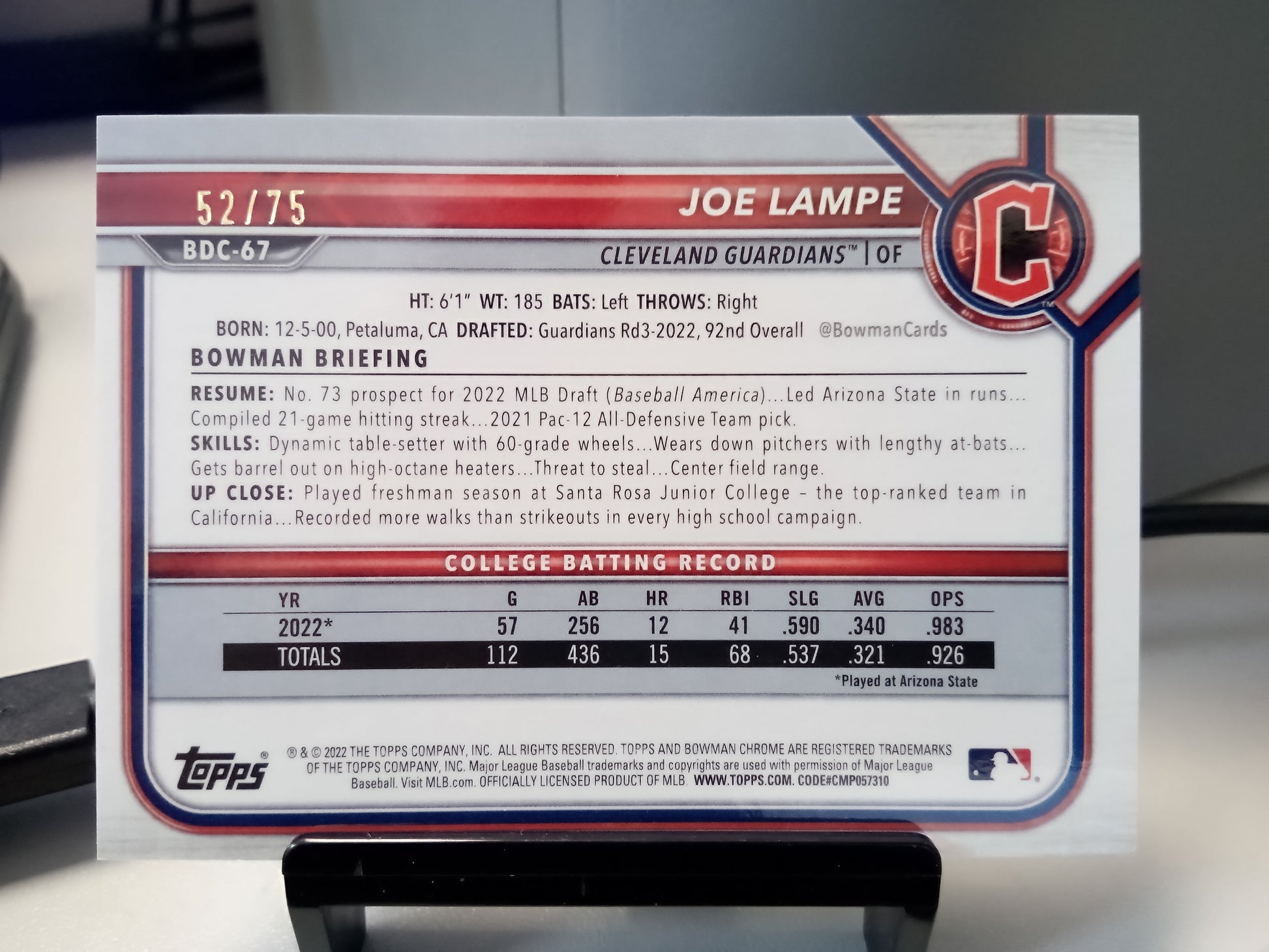 2022 Bowman Draft Chrome * Joe Lampe * #52/75 Yellow Lava Refractor #BDC-67